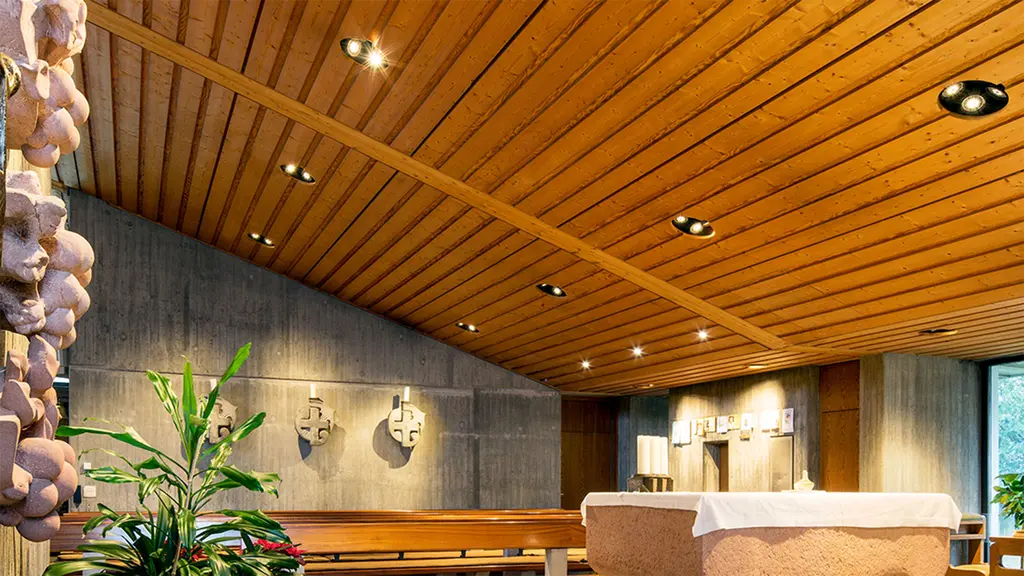 Für die Beleuchtung des Innenraums der Kirche wurde eine Beleuchtungssanierung gewünscht. Es sollte eine flexible Lösung mit Spotlights und Grundbeleuchtung werden, die geringen Wartungsaufwand und eine lange Lebensdauer mit sich bringt. Es wurde eine dimmbare LED-Technik gewählt, die den Energieverbrauch um 80 % senkt.
