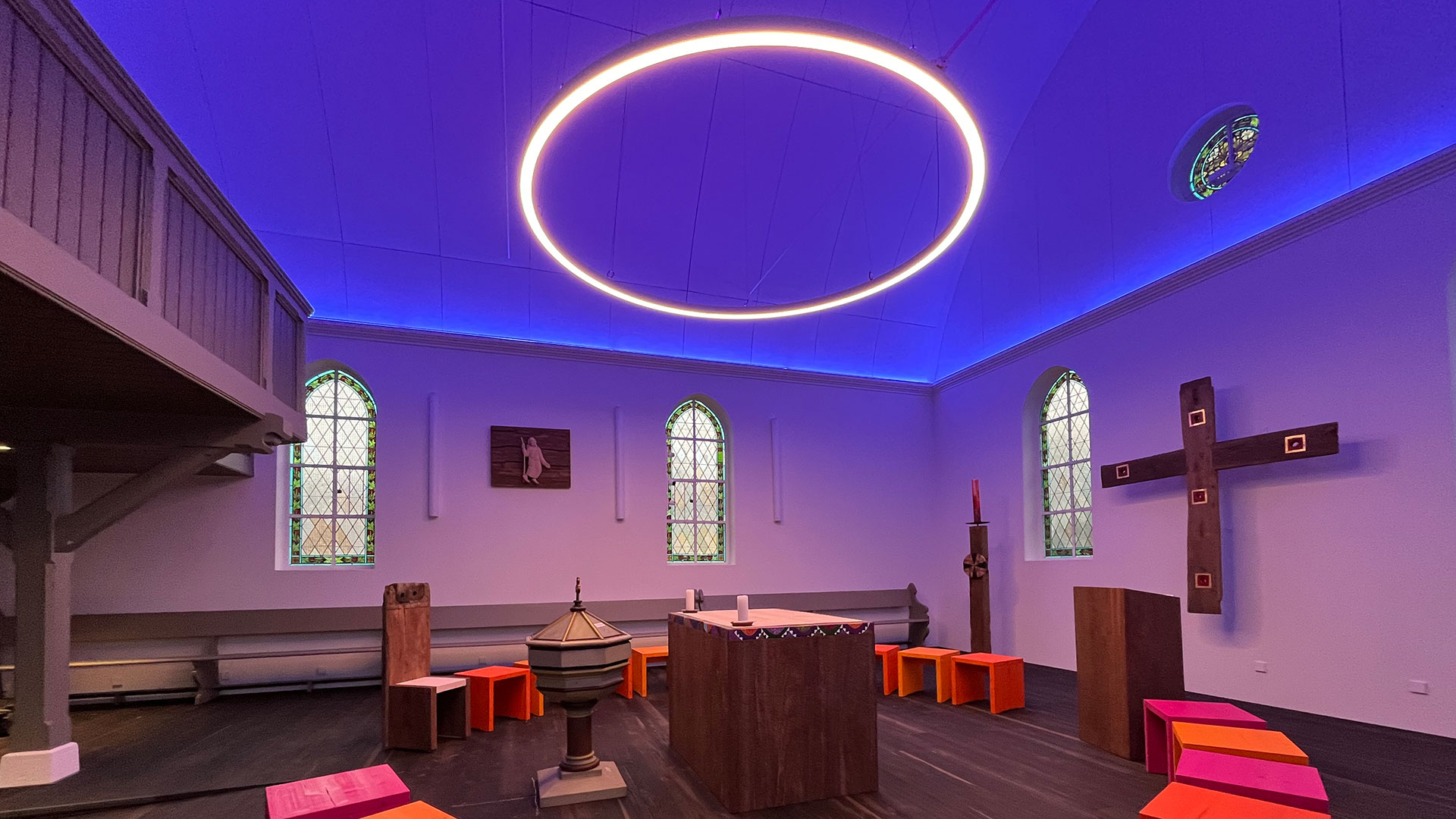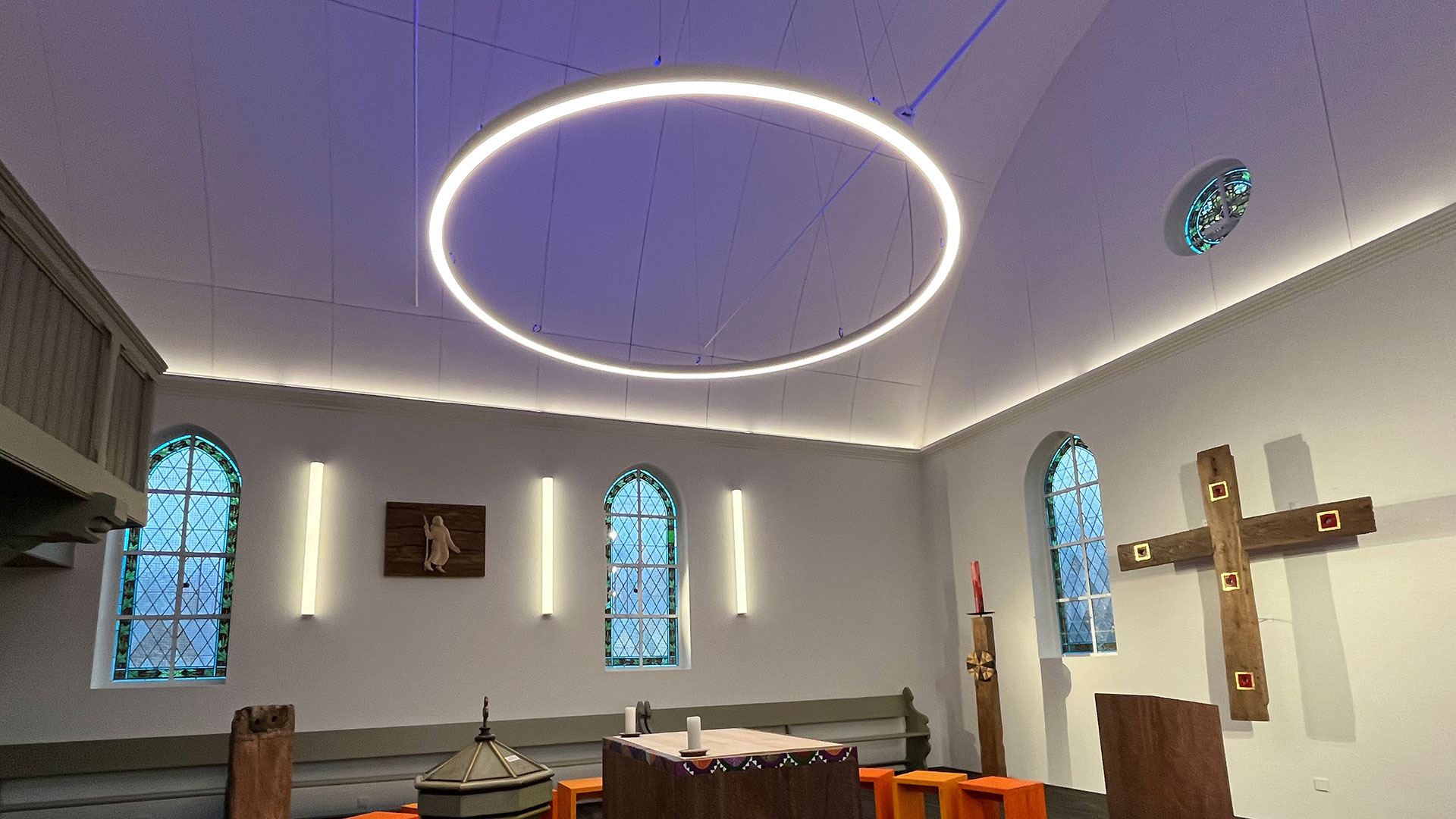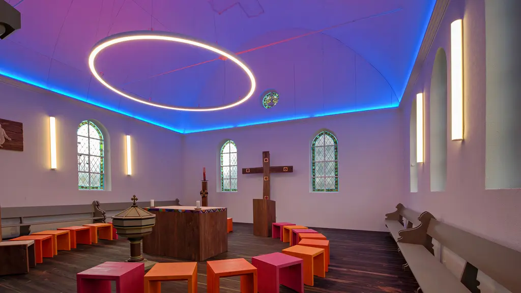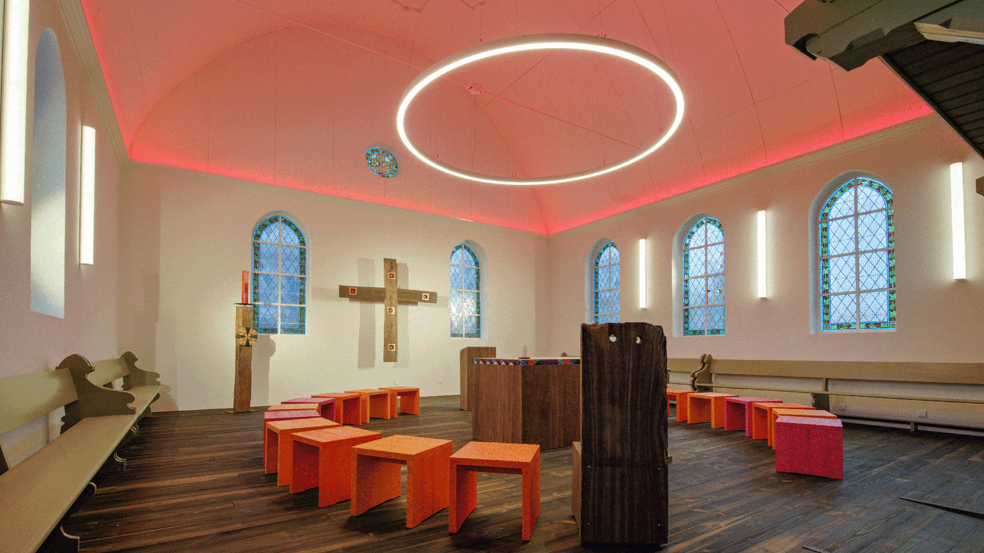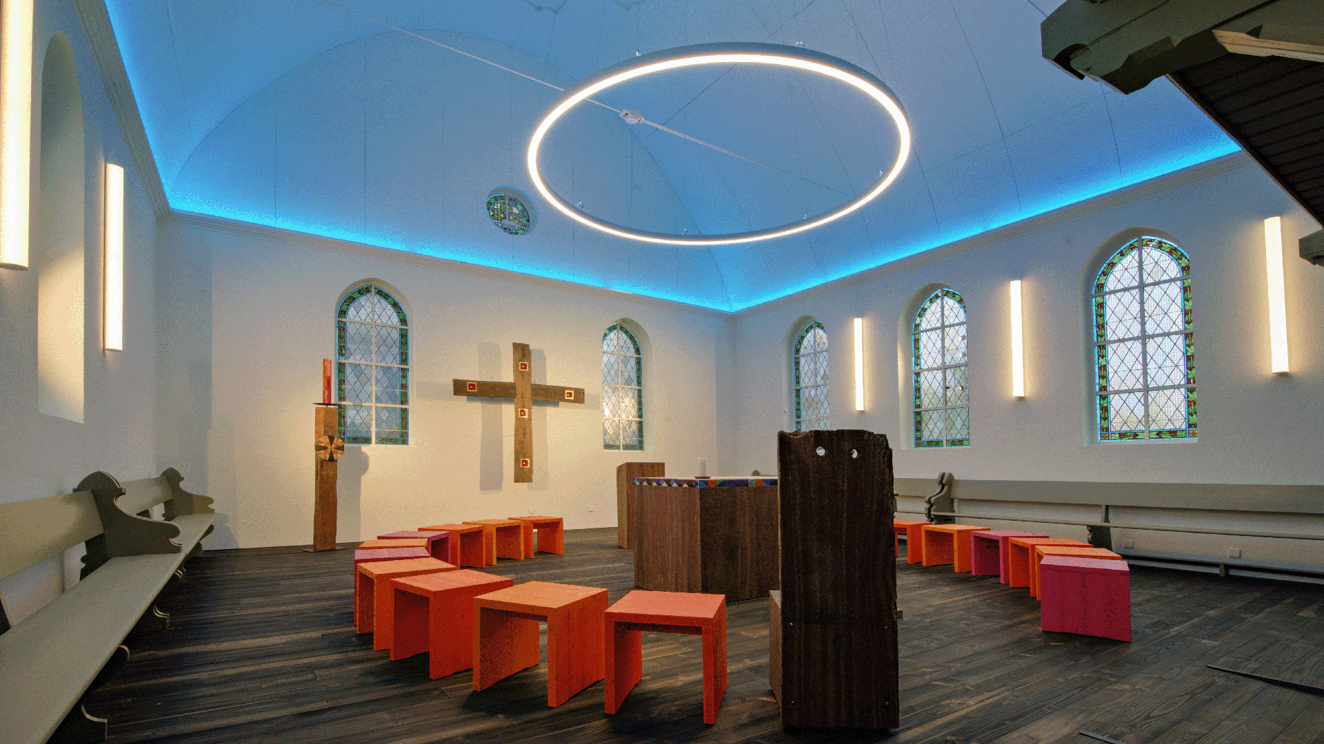 Die Lichtplaner von Alexander Bürkle haben den Raum in 3D nachgebildet, gerendert und visualisiert. Dabei wurden auch verschiedene Farblichtszenen dargestellt. Als zentrales Element wurde eine gependelte Ringleuchte (Lightnet) mit 3m Durchmesser eingeplant, welcher im Direktanteil mit 3000K und im Indirektanteil mit RGB-W ausgestattet ist. Der 10cm breite Fries unterhalb der der gewölbten Dachkonstruktion wurde durchgängig mit RGB-W Profilleuchten (LIKU) bestückt. Die Grundbeleuchtung wird ergänzt durch 6 länglichen Wandleuchten (XAL) mit zylindrischer Abdeckung. Unter der Empore sind blendfreie, schwarze Einbauspots (LTS) mit zurückgesetzter LED. Der Altar und das Kreuz wird mit Stromschiene-Richtstrahlern (LTS) von den vorderen Fensterlaibungen in Scene gesetzt.