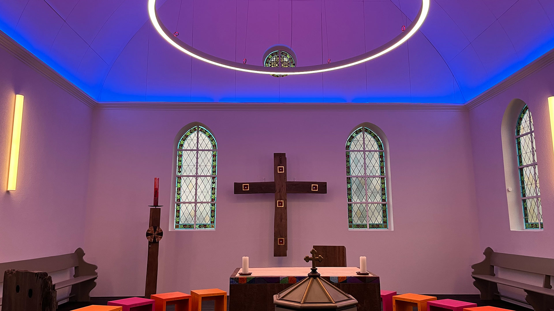 Alle Leuchten wurden mit Casambi Bausteinen ausgestattet, was der Gemeinde die Möglichkeit bietet, mit gezielten Lichtszenen per Tablet und auch fest installierten Tastern den Raum an die Gottesdienste und Veranstaltungen anzupassen. Dabei spielt das Farblicht, welches das Kirchendach beleuchtet, eine bedeutende Rolle. Der Schaltschrank für die Indirektbeleuchtung und die Lichtsteuerung wurde von Alexander Bürkle panel solutions GmbH in Malterdingen gebaut.