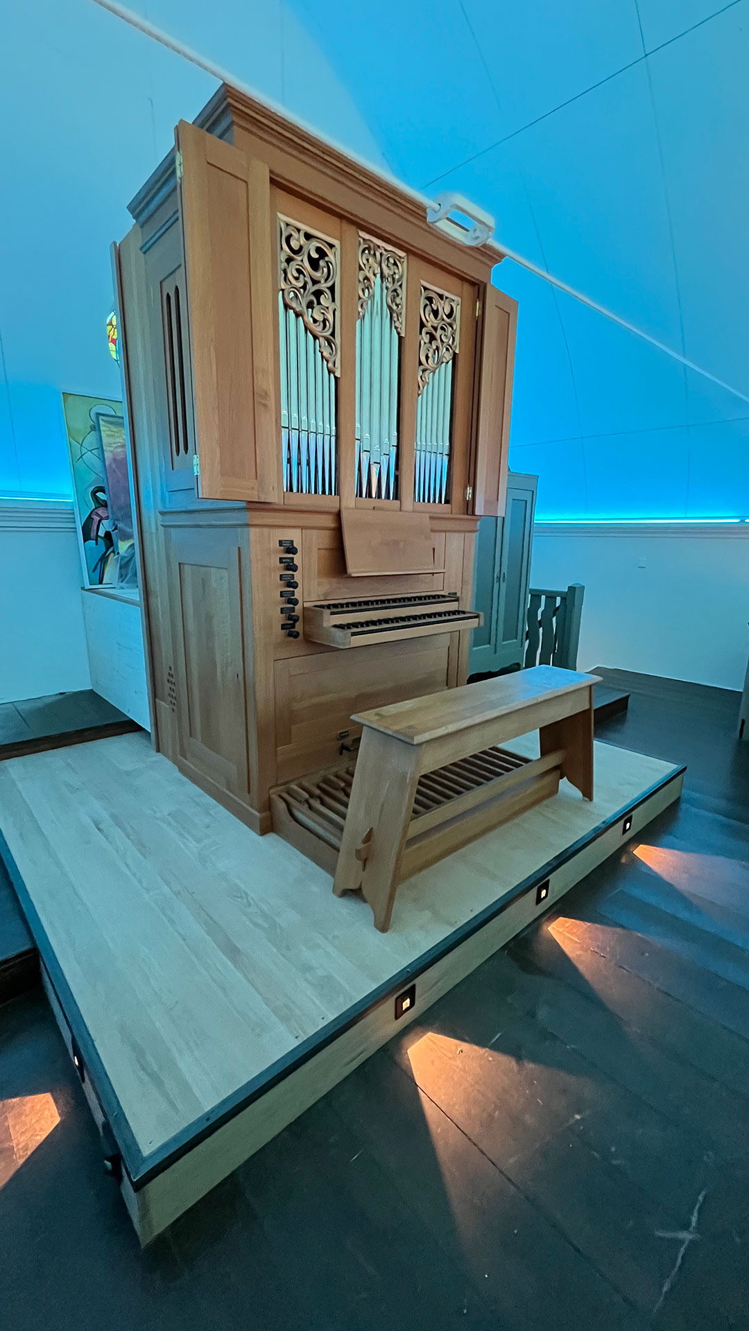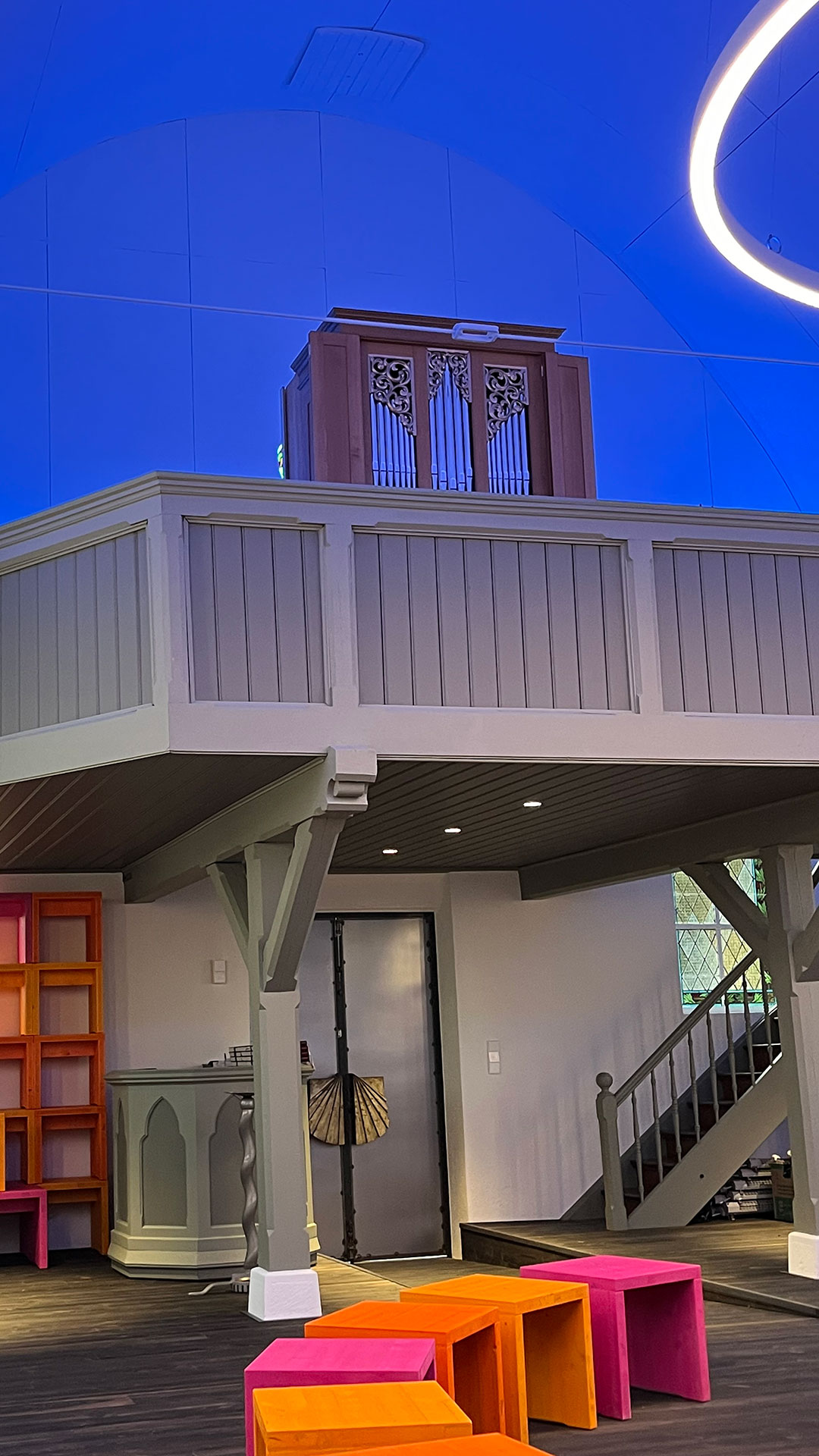 Die Kanzel wird zur „Eingangstheke“ mit Akzentbeleuchtung