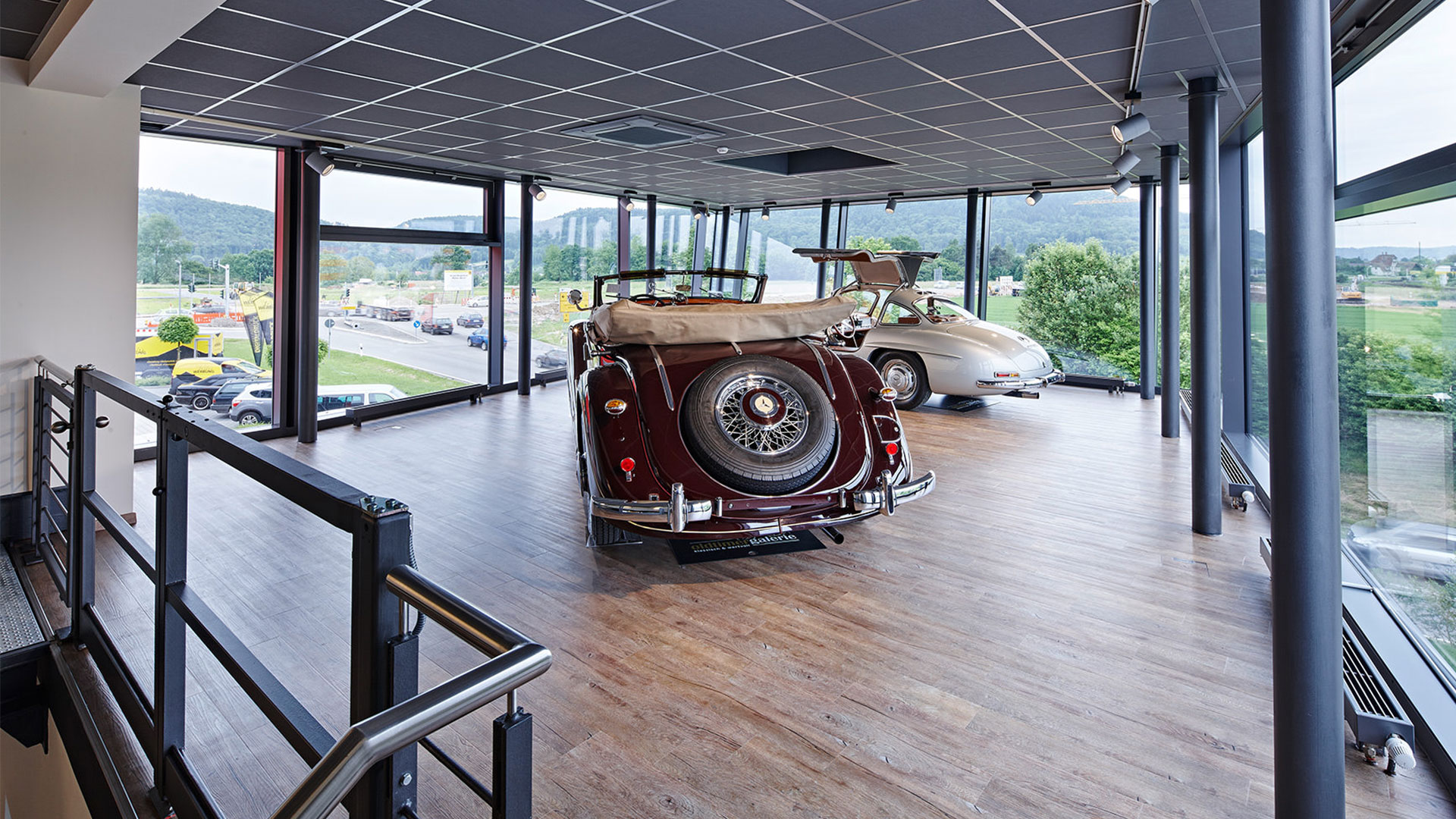 Im Erdgeschoss sorgt eine Grundbeleuchtung mit diffusem Raumlicht für eine angenehme Raumatmosphäre. Die Spots an den Stromschienen setzen zusätzliche Akzente. Im Obergeschoss werden die besonderen Modelle mit Spotlicht so in Szene gesetzt, dass sie bereits von Weitem ins Auge stechen. Durch die Lichtsteuerung können auch bei Veranstaltungen die Lichtverhältnisse angepasst und geregelt werden.