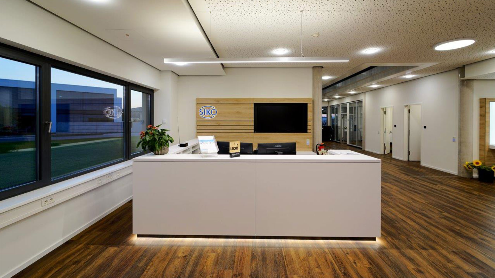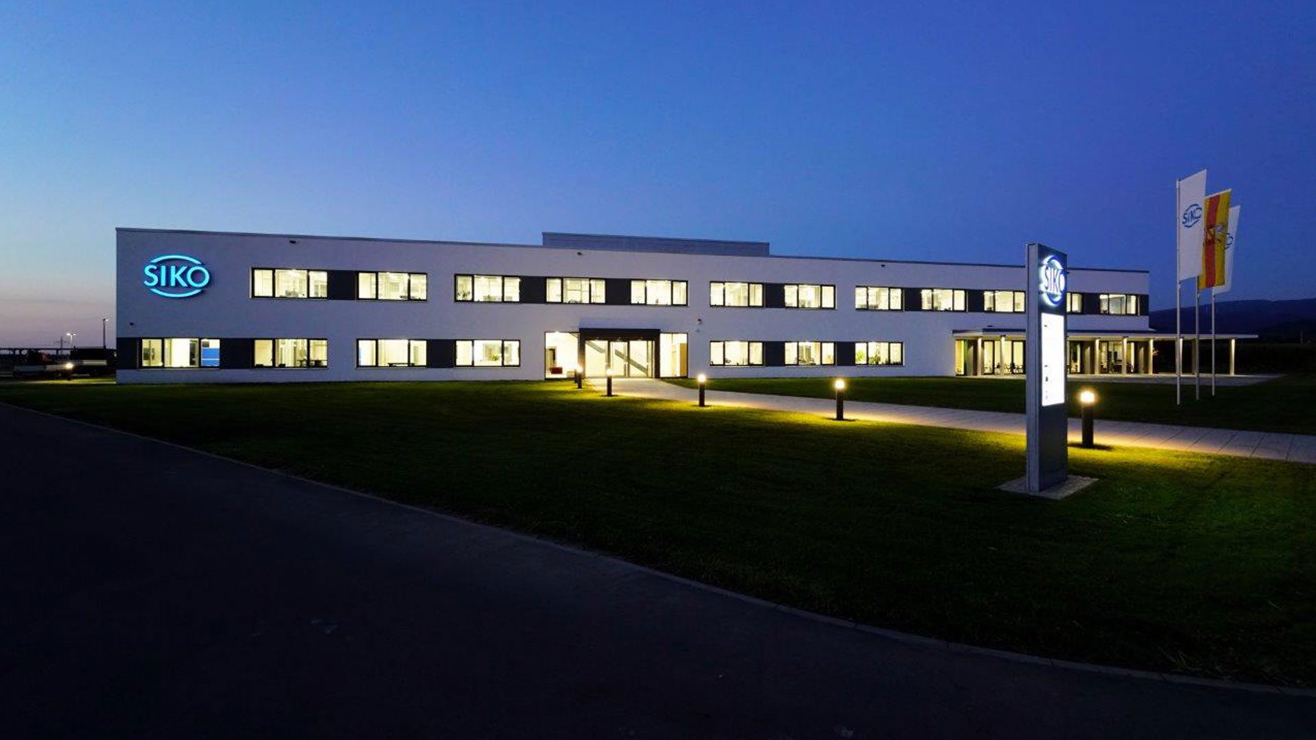 Für den Neubau des Produktions- und Verwaltungsgebäudes wünschte die SIKO GmbH eine effiziente und langlebige Lichtlösung. Im Verwaltungsgebäude sollte ein hochwertiges Design umgesetzt werden, und auch die Außengestaltung war von Bedeutung: Bei Nacht sollte das Gebäude eine ansprechende Fernwirkung ausstrahlen.