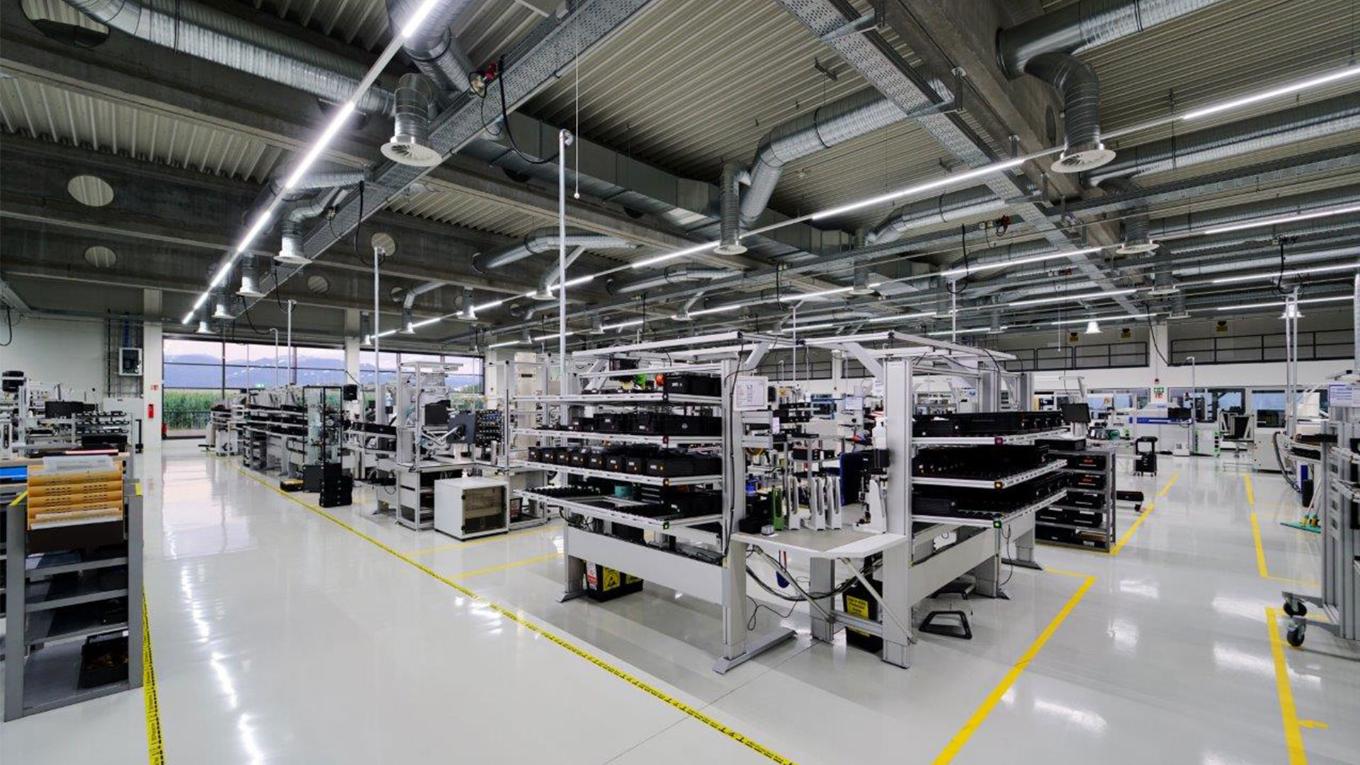 Produktionshalle mit effizienten und langlebigen LED-Lichtbändern. Das Lichtkonzept für das Verwaltungsgebäude wurde von der Firma Luxwerk erstellt.