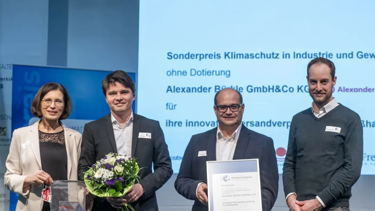 Umweltbürgermeisterin Christine Buchheit beglückwünschte Simon Straub (Geschäftsführer Logistik & IT Alexander Bürkle GmbH & Co. KG), Andreas Treffeisen (Leiter Qualitätsmanagement) und Christopher Hatz (Nachhaltigkeitsmanager), die den Preis entgegennahmen.