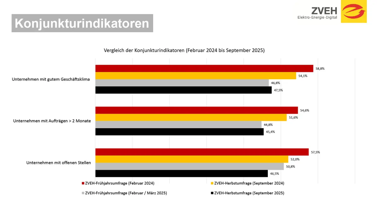 Zwischen dem 15. und 26. September beteiligten sich 1.562 Betriebe an der Erhebung. Die Ergebnisse gelten damit als repräsentativ und machen zugleich deutlich, wie sehr wirtschaftliche Stimmung von psychologischen Faktoren abhängt. Denn obwohl der Geschäftsklimaindex leicht gestiegen ist, erwarten rund 20 Prozent der Betriebe eine Verschlechterung ihrer Situation. "Somit überlagert die gesamtwirtschaftliche Lage klar die Geschäftserwartungen der E-Handwerke", erklärt der Verband. Kurz gesagt: Die Vielzahl negativer Nachrichten drückt die Stimmung.