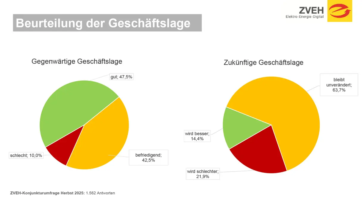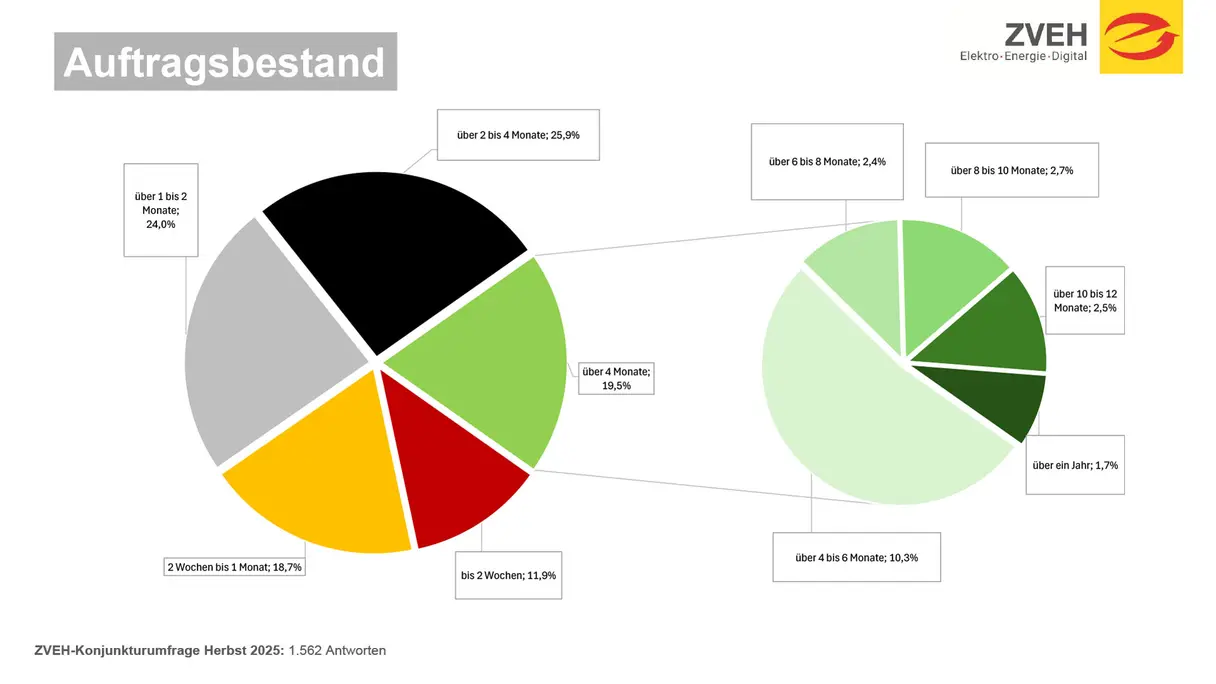 Der Auftragsvorlauf ist leicht rückläufig – im Durchschnitt von 13,0 auf 12,3 Wochen. Dennoch bleibt die Auftragslage robust. Laut ZVEH liegt das auch daran, dass die Umsatzanteile im Neubau und in der Sanierung etwas gestiegen sind – zusammen auf 33,4 Prozent (Frühjahr 2025: 31,2 Prozent).