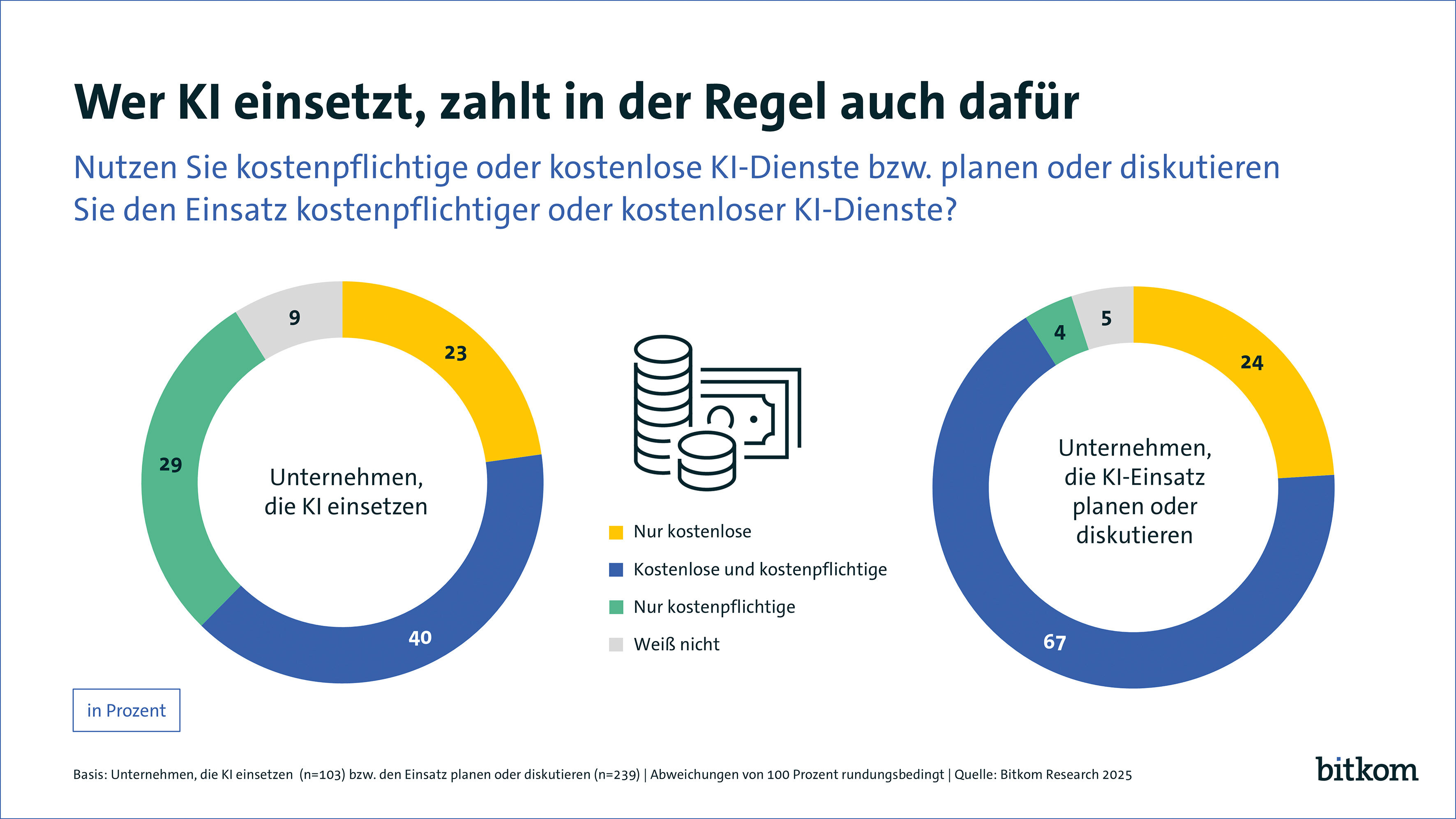 So nutzen 17 Prozent der Unternehmen in Deutschland KI. Von ihnen setzen 29 Prozent ausschließlich auf kostenpflichtige Angebote, 40 Prozent nutzen sowohl kostenpflichtige als auch kostenlose und 23 Prozent nur kostenlose.