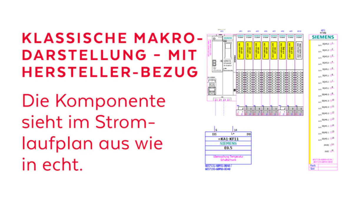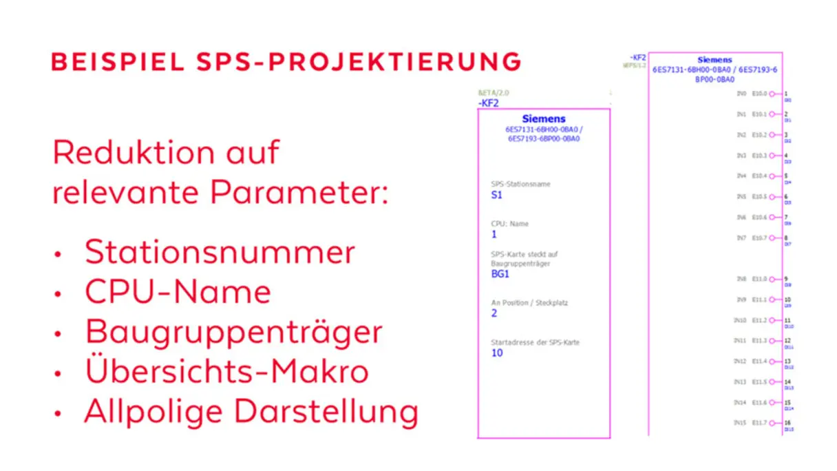 Der EPLAN-Data-Standard löst dieses Problem – durch herstellerneutrales Engineering. Wir haben analysiert, was die relevanten SPS-Parameter für EPLAN sind und die Darstellung darauf reduziert: Stationsname, CPU-Name, Baugruppenträger, Übersichts-Makro. Die allpolige Darstellung wurde betrachtet: Was muss sie können, damit die Plattform mit den komplexen Daten komplett rund läuft. Für digitale Ein- und Ausgänge werden Platzhalter gesetzt. So können wir komplett herstellerunabhängig planen – so lange, bis der Hersteller feststeht.