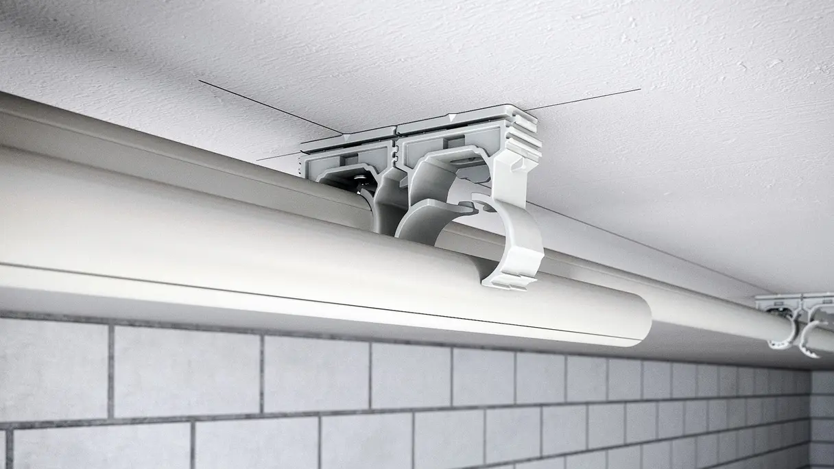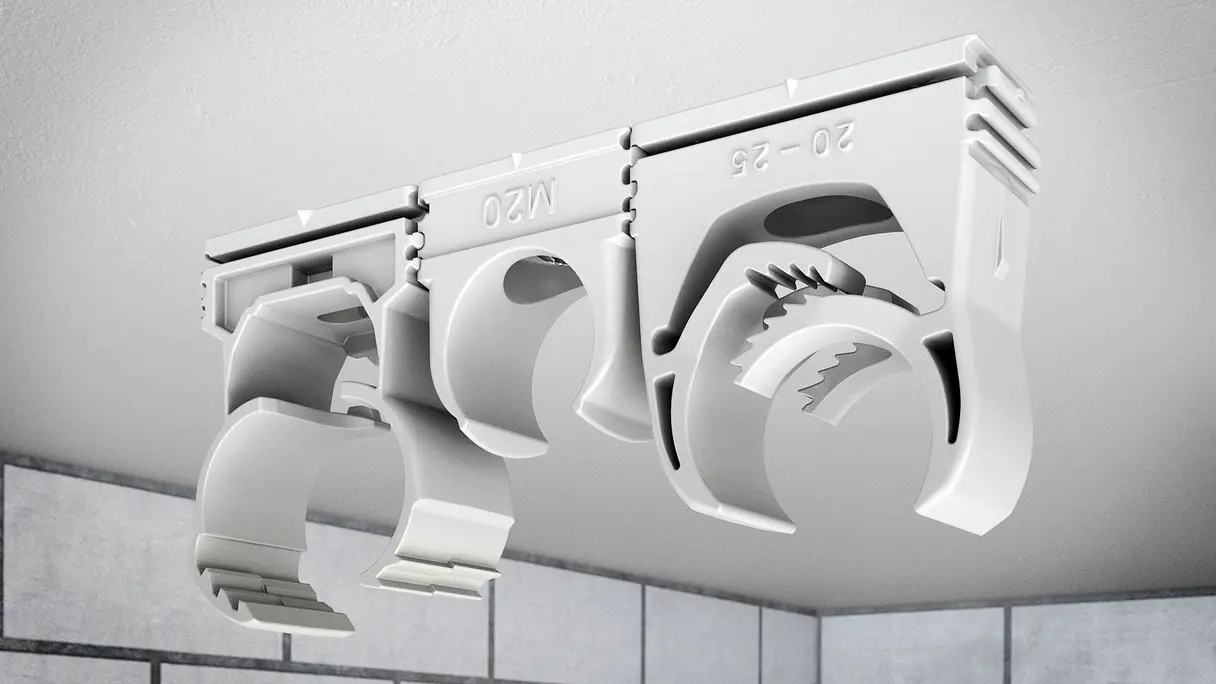 Die patentierte Anreihkontur der Schellen sorgt für hohe Stabilität und Tragkraft – ein durchdachtes Detail, das Montagezeit spart und gleichzeitig für zuverlässige Befestigungslösungen sorgt. Alle Schellen der OBO Quick-Serie können dank der Anreihkontur miteinander verbunden werden: Eine Bohrung ermöglicht die Montage von drei Schellen.