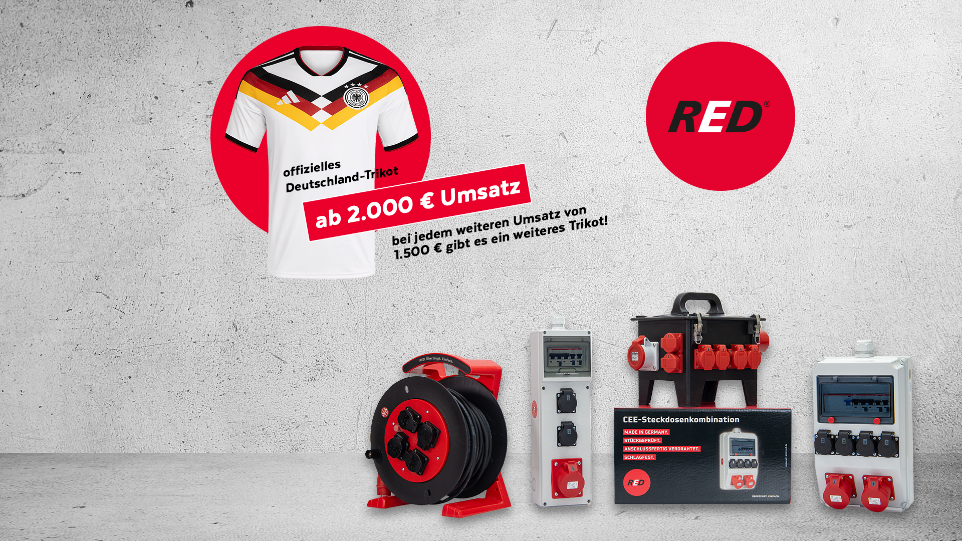 Nutzen Sie die RED-Umsatz-Aktion und verwandeln Sie Ihre Einkäufe in eine attraktive Prämie. Bestellen Sie bis zum 31. März 2026 RED Produkte über unseren Onlineshop und sichern Sie sich - abhängig von Ihrem Gesamtumsatz - ein originales Fußball-Trikot der Deutschen Nationalmannschaft.