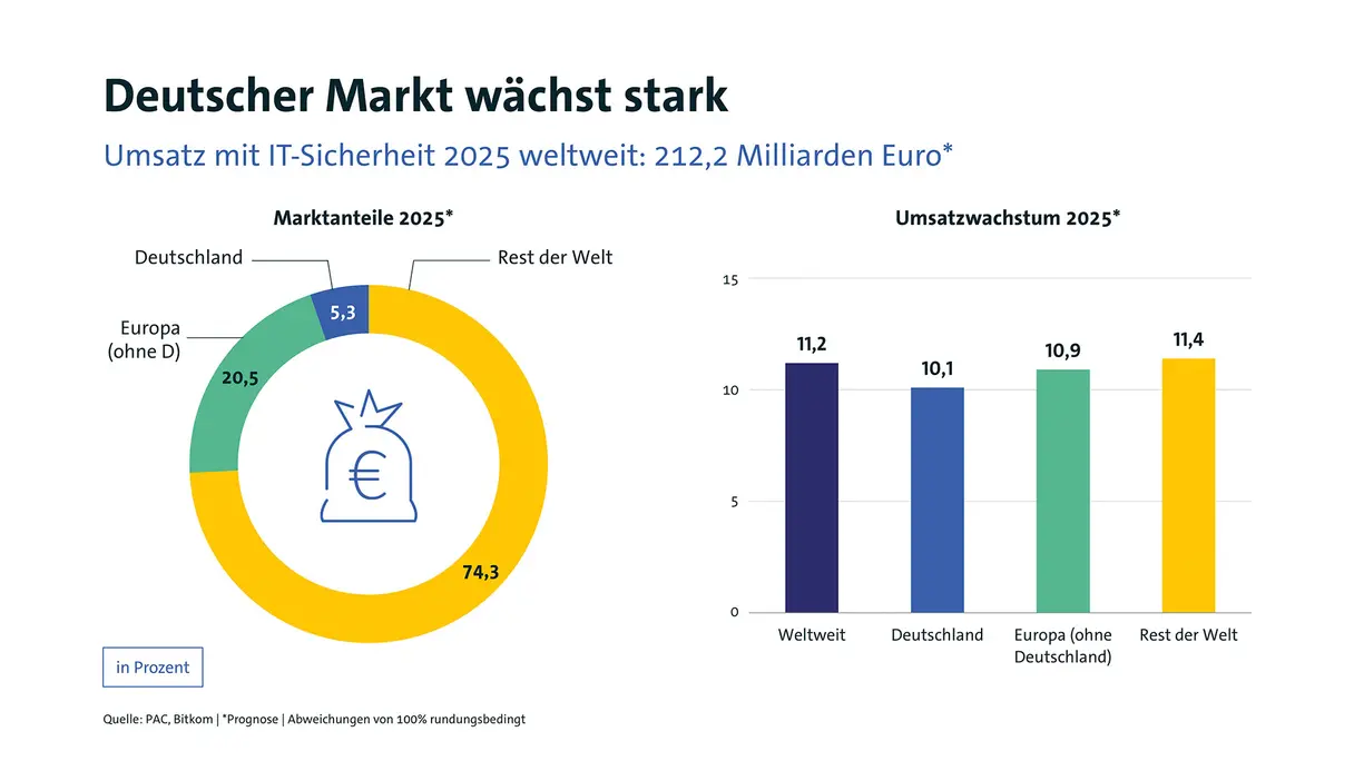 Das Ergebnis: Unternehmen in Deutschland verstärken ihre Schutzmaßnahmen gegen Cyberangriffe und investieren zunehmend in IT-Sicherheitslösungen. Für das laufende Jahr wird ein Ausgabenanstieg um 10,1 Prozent auf 11,1 Milliarden Euro erwartet, nachdem im Jahr 2024 erstmals die Marke von 10 Milliarden Euro überschritten wurde. Bis 2026 sollen die Investitionen um weitere 9,9 Prozent auf 12,2 Milliarden Euro steigen.